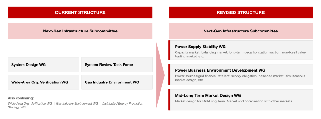 The Ministry of Economy, Trade, and Industry (METI) announced at the Next Generation Infrastructure Development Subcommittee that it will establish three new working groups (WGs) related to power system reform. The Power Supply Stability WG will cover issues such as the capacity market and reserve power, the Power Business Environment Development WG will discuss long-term supply capacity obligations for retail electricity suppliers and financing, and the Mid-Long Term Market Design WG will be established for about a year to work on detailed market design. All WGs will work under the Next-Generation Infrastructure Development Subcommittee, and each WG is expected to meet once a month from FY2026.